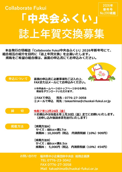 中央会からのお知らせ · 2025/11/17 「Collaborate Fukui 中央会ふくい」2026年新年号誌上年賀交換募集 本会発行の情報誌「Collaborate Fukui 中央会ふくい」2026 年新年号にて、組合相互の紹介を目的に「誌上年賀交換」を企画いたします。 掲載をご希望の組合様は、下記の申込書をダウンロードしていただき、必要事項をご記入の上、お申込みください。 昨年度掲載いただいた組合様はこちら ★年賀広告申込書(昨年度掲載組合用).docx Microsoft Word 22.8 KB ダウンロード 新規申込はこちら ★年賀広告申込書(新規申込用).docx Microsoft Word 40.6 KB ダウンロード tagPlaceholderカテゴリ: