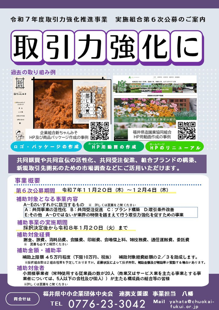 本事業は、中小企業者・小規模事業者の取引力強化を図るために組合が行うホームページやチラシの作成等、共同事業の活性化・組合員の受注促進等の取組みに対して支援を行う事業です。