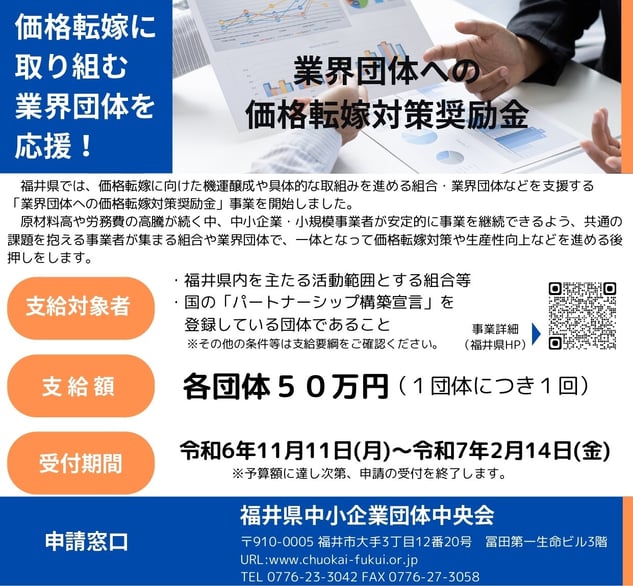 中央会からのお知らせ · 2024/11/11 「業界団体への価格転嫁対策奨励金」の受付を開始しました! ・事業詳細 福井県のホームページをご確認ください。 https://www.pref.fukui.lg.jp/doc/sinsan/kakakutenka.html ・要 綱 業界団体への価格転嫁対策奨励金支給要綱.pdf PDFファイル 191.1 KB ダウンロード ・提出書類 ①様式1 様式1 「業界団体への価格転嫁対策奨励金 支給申請書兼請求書」.docx Microsoft Word 15.8 KB ダウンロード ②別紙 別紙 「業界団体への価格転嫁対策奨励金事業実施計画書」.docx Microsoft Word 21.4 KB ダウンロード ※事業実施計画書については、中央会の指導の下作成していただきます。 ③振込先口座の預金通帳の写し (金融機関名、本支店名、店番号、口座の種類、口座番号、口座名義(カナ)の記載されているページ) tagPlaceholderカテゴリ:
